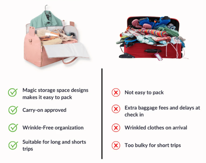 Tired of trying to fit all of your belongings into a suitcase? Well,.those days are over! Travel in an organized fashion withour wrinkle free, aesthetically pleasing bag.